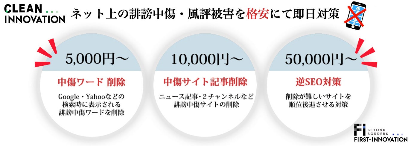 クリーンイノベーションでは、中傷ワード対策や中傷サイト記事対策、逆SEO対策(検索順位後退)などネット上の誹謗中傷・風評被害を格安にて即日対応いたします。