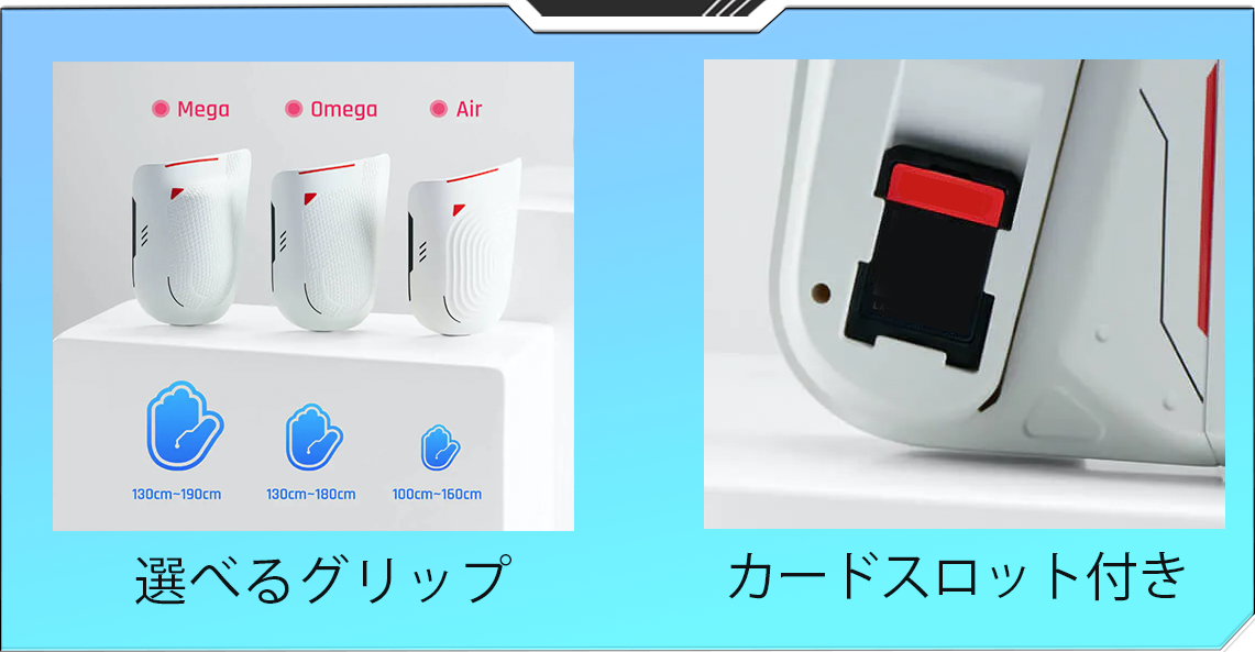 ケースのグリップ部分は3種類のサイズから付け替え可能のため、お子様から大人の方まで幅広いタイプの手にフィットします。また、グリップ部分を外すと左右にカードスロットが設計されており、ケース本体の中に最大2つまでゲームソフトを収納できます。