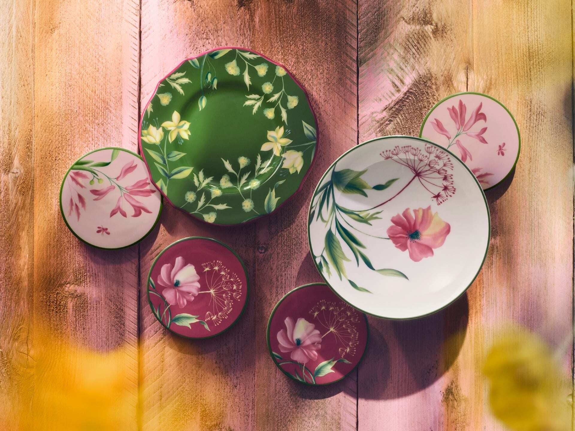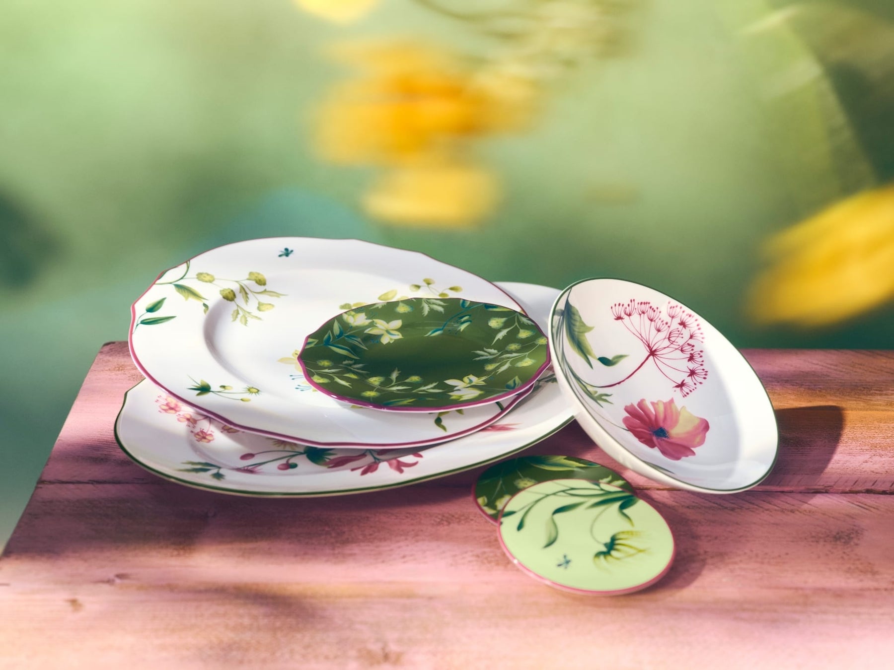 このコレクションは、対照的でありながら調和する二つの力強さを表現しています。豊かな色彩が形に個性と深みをまとわせる作品と、シンプルな植物のモチーフで軽やかさを添えた白地を基調とした作品が組み合わされています。両者の対話がリズムと息吹、視覚的な自由を生み出し、常に変化する個人の感性に従って食卓を彩ることを提案します。