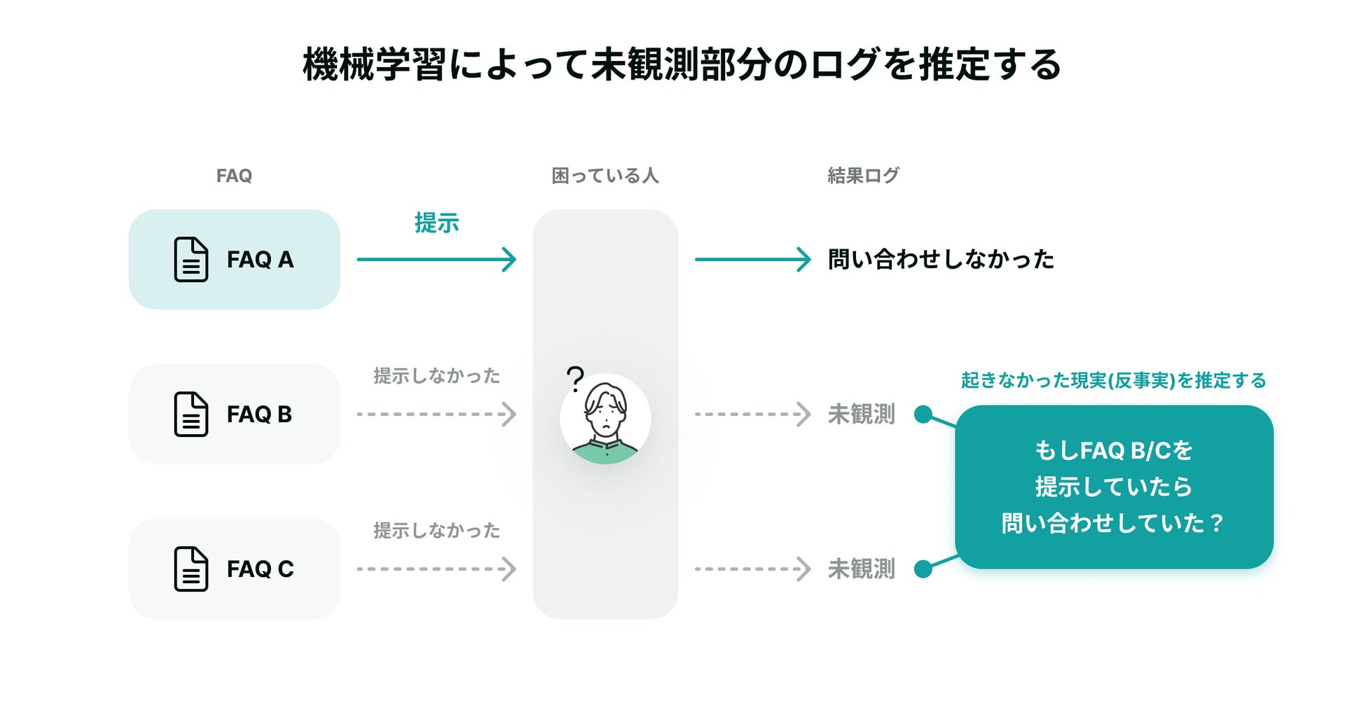 しかし、ログデータには「実際に提示したFAQへの反応」しか含まれておらず、提示しなかったFAQに対する反応は記録されていません。このような選択バイアスを含むデータに対し、適切なアクションを学習する方法として注目されているのが反実仮想機械学習です。