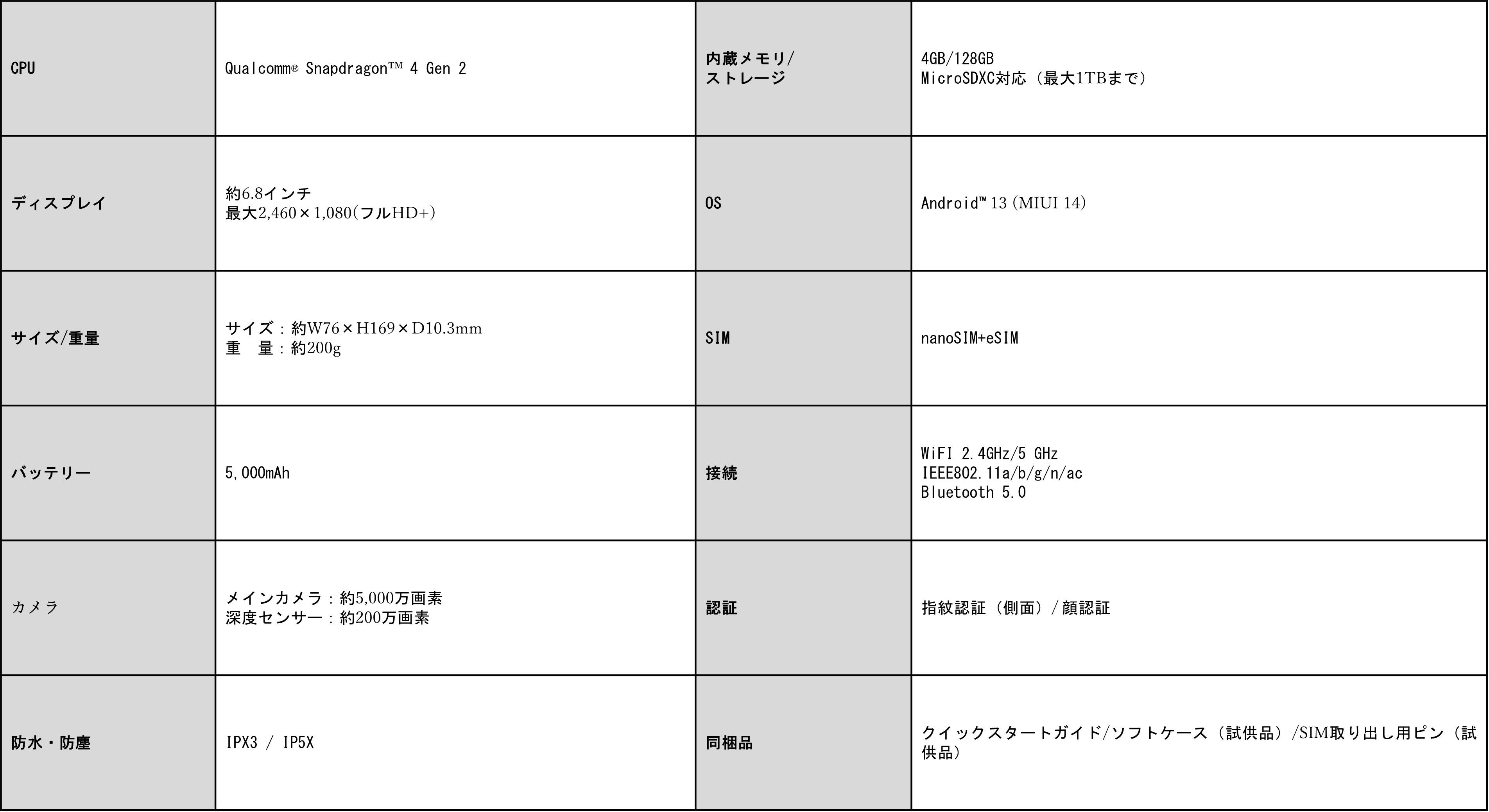 外観デザインは背面に高級感あふれるガラス素材を採用。処理性能に関しても、最新の4nm製造プロセス5Gチップセット「Qualcomm® Snapdragon™ 4 Gen 2」を搭載することで、省電力かつ快適な操作性を実現しています。3.5mmイヤホンジャックやFMラジオ、指紋認証/顔認証など日常をサポートする機能も充実しています。