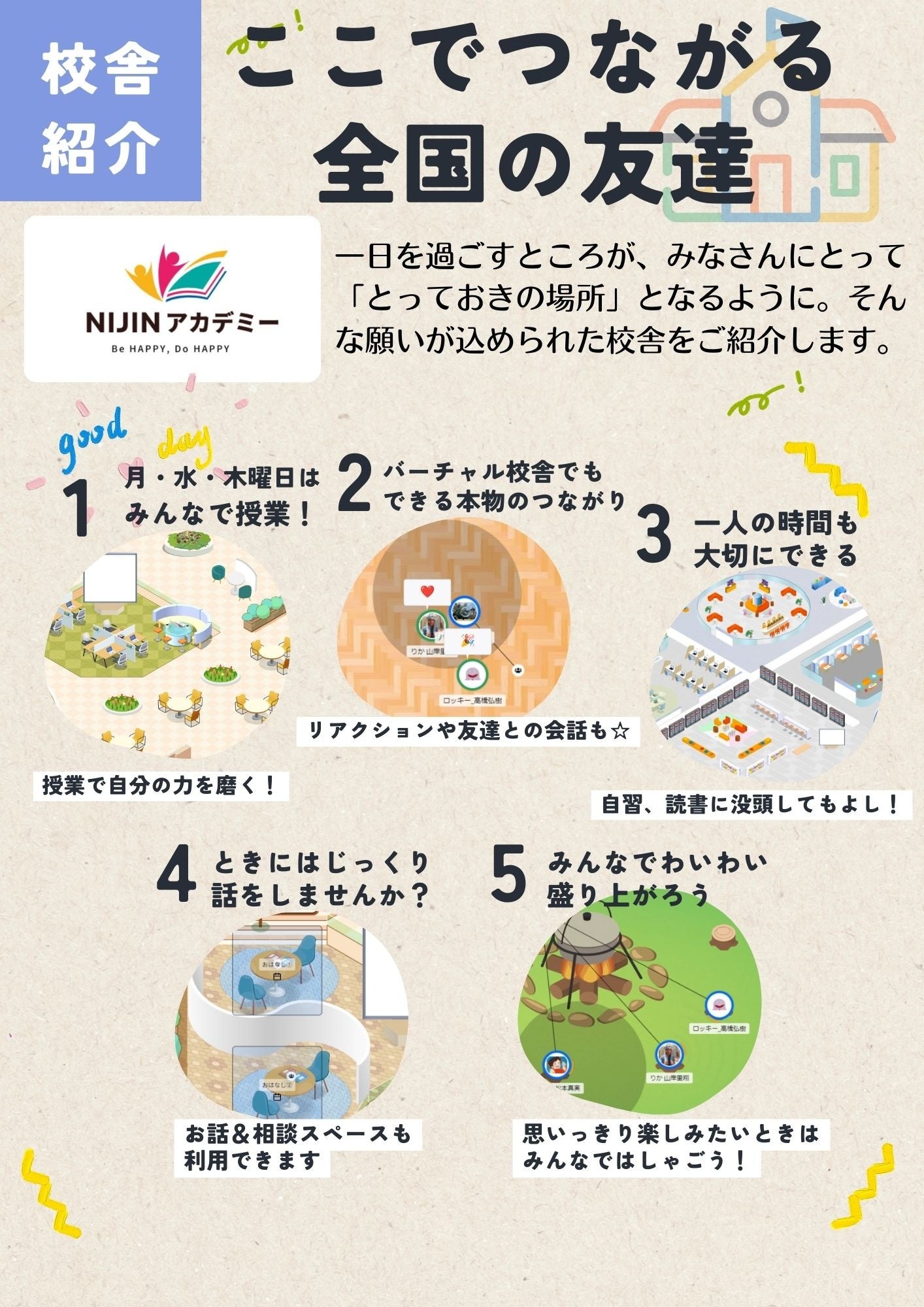 学校に通うことができない子、学校で自分を出せずにいる子、学校でHAPPYでいられない子のための新しい学び選択肢、それがNIJINアカデミーです。