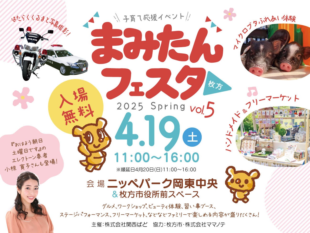 株式会社関西ぱど(本社:大阪市西区靭本町1-10-24 三共本町ビル5F 代表取締役 富岡 紀幸)は、2025年4月19日(土)に、京阪枚方市駅下車スグのニッペパーク岡東中央と枚方市役所前スペースにおいて、子育て世代応援イベント「まみたんフェスタ枚方~2025 Spring vol.5~」を開催いたします。