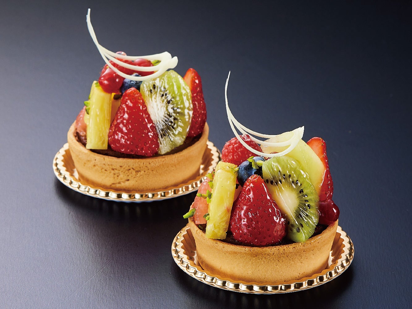 色とりどりのフルーツをたっぷり乗せた王道のフルーツタルト。アーモンド生地にガナッシュ、カスタードクリームを合わせたシンプルなタルトに、フルーツの爽やかな酸味が相性抜群です。