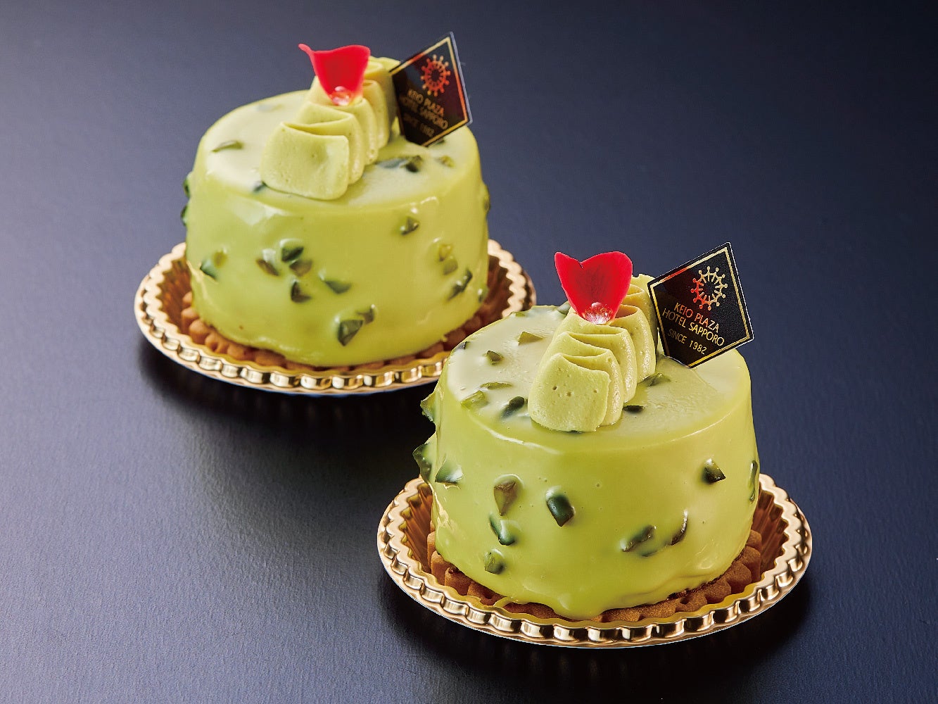 雪が解けやっと迎える春の緑をイメージ。ピスタチオのガトーの中には、北海道産マスカルポーネのクリームとフランボワーズとグリオットのジュレ。ピスタチオの香ばしさとフランボワーズの酸味をお楽しみください。