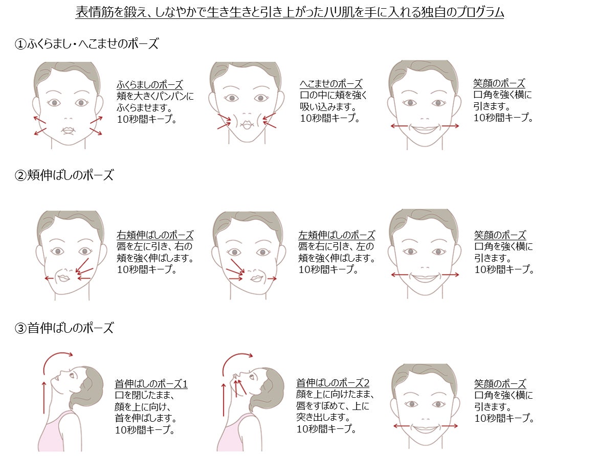 ・クリームをなじませた後、フェイスマッスルプログラムで表情筋を鍛えるエクササイズをするとさらに効果的です。