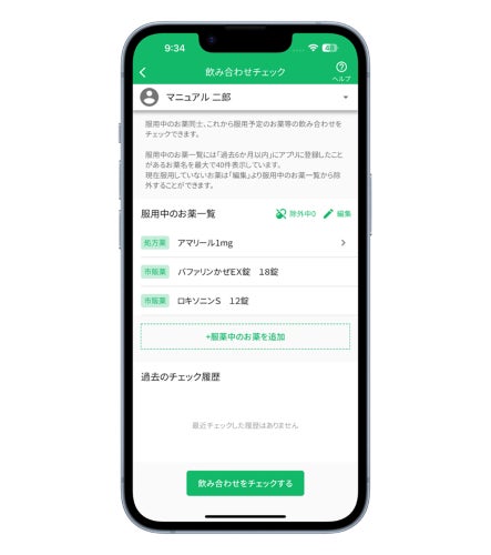 服薬の管理では、処方されたお薬だけでなく、市販薬の登録もできます。成分や効果の確認や、服薬中のお薬同士の飲み合わせに注意が必要か確認ができます。
