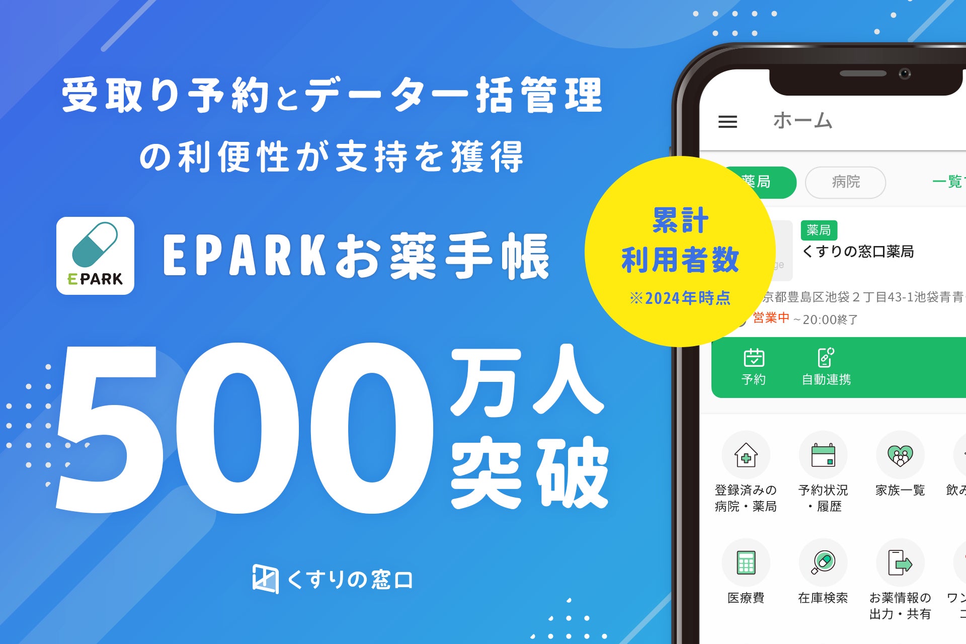 株式会社くすりの窓口(本社:東京都豊島区、代表取締役社長:堤 幸治、以下「当社」)が運営する、電子お薬手帳アプリ「EPARKお薬手帳」(以下「当アプリ」)は、累計利用者数が500万人を突破したことをご報告いたします。