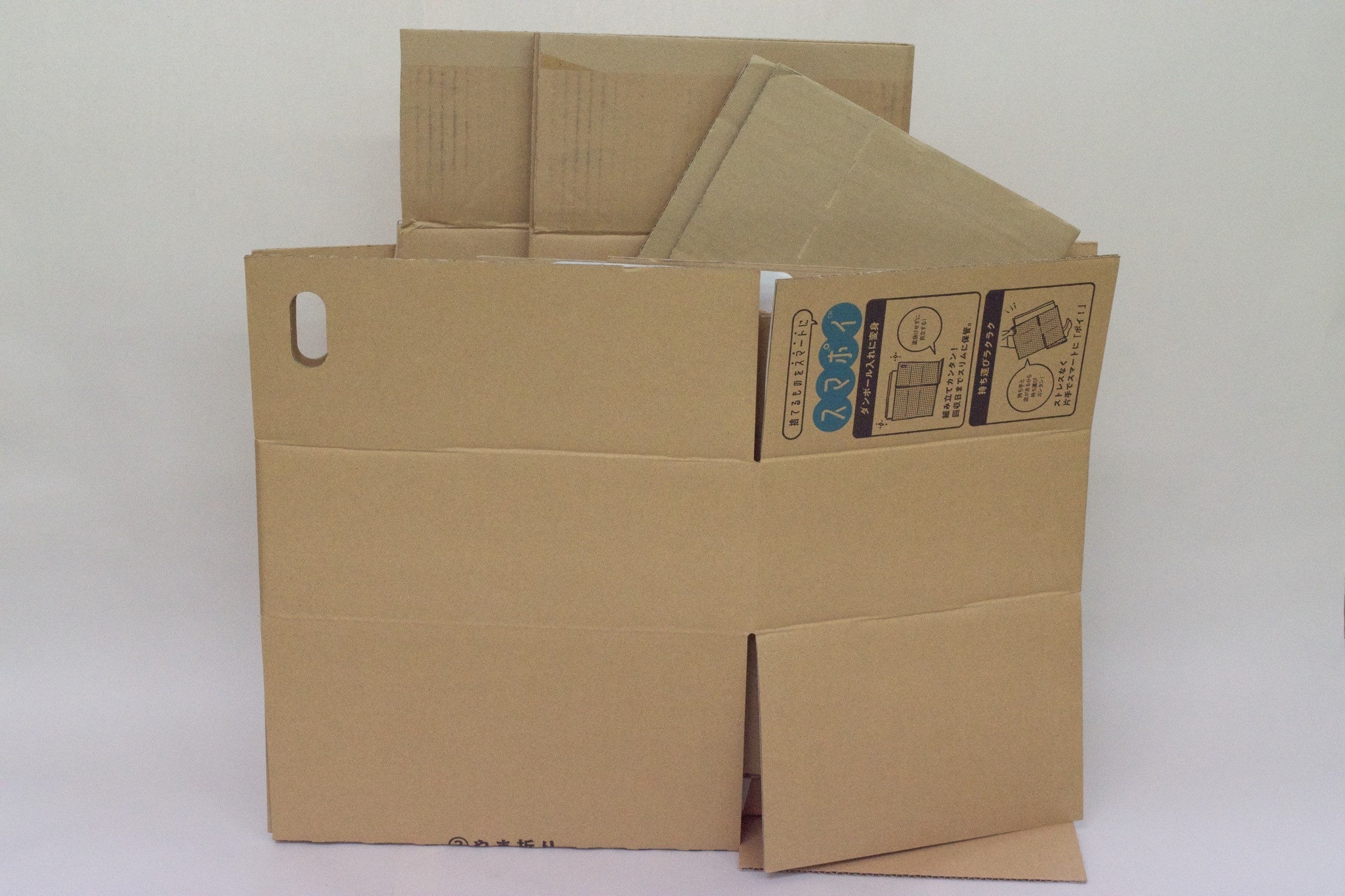 いつものダンボールが、組み立てることでストッカーへ大変身!ヒモを使わずに使用済みダンボールをまとめて保管することができます。しかも取っ手付で、片手でラクラク持ち運びが可能。受取側に配慮した画期的な商品です。※特許出願中