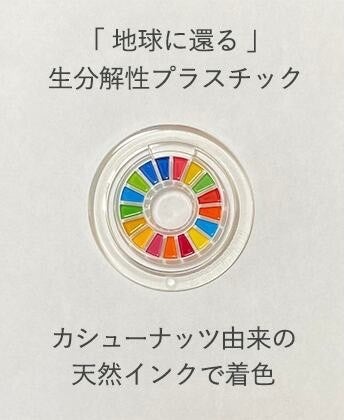 さとうきびの搾汁・とうもろこしのでんぷんと乳酸菌から作られた、土に埋めると生分解する植物系プラスチックのPLA(ポリ乳酸)で成形し、カシューナッツ由来の天然インクで着色した地球に優しい商品です。