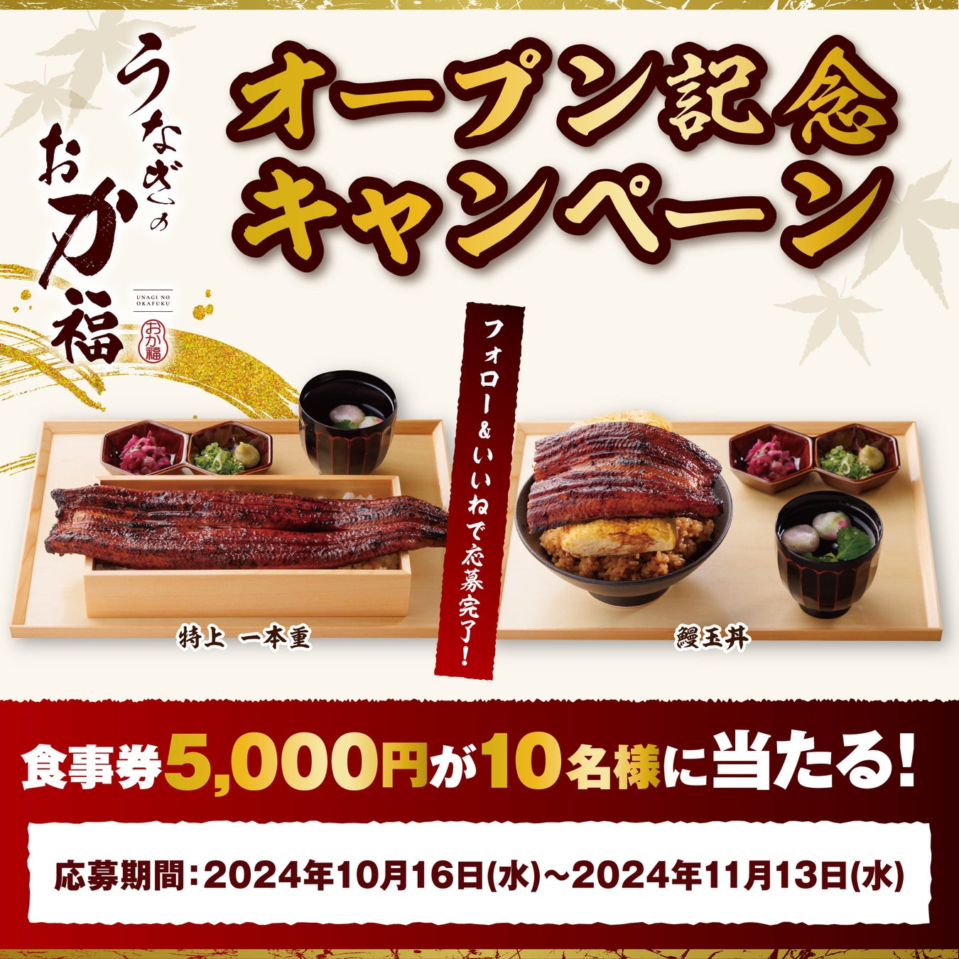 ②グランドオープンを記念して、公式Instagramをフォロー&いいねで食事券5,000円が10名様に当たる!【イベント期間:2024年10月16日(水)〜2024年11月13日(水)】