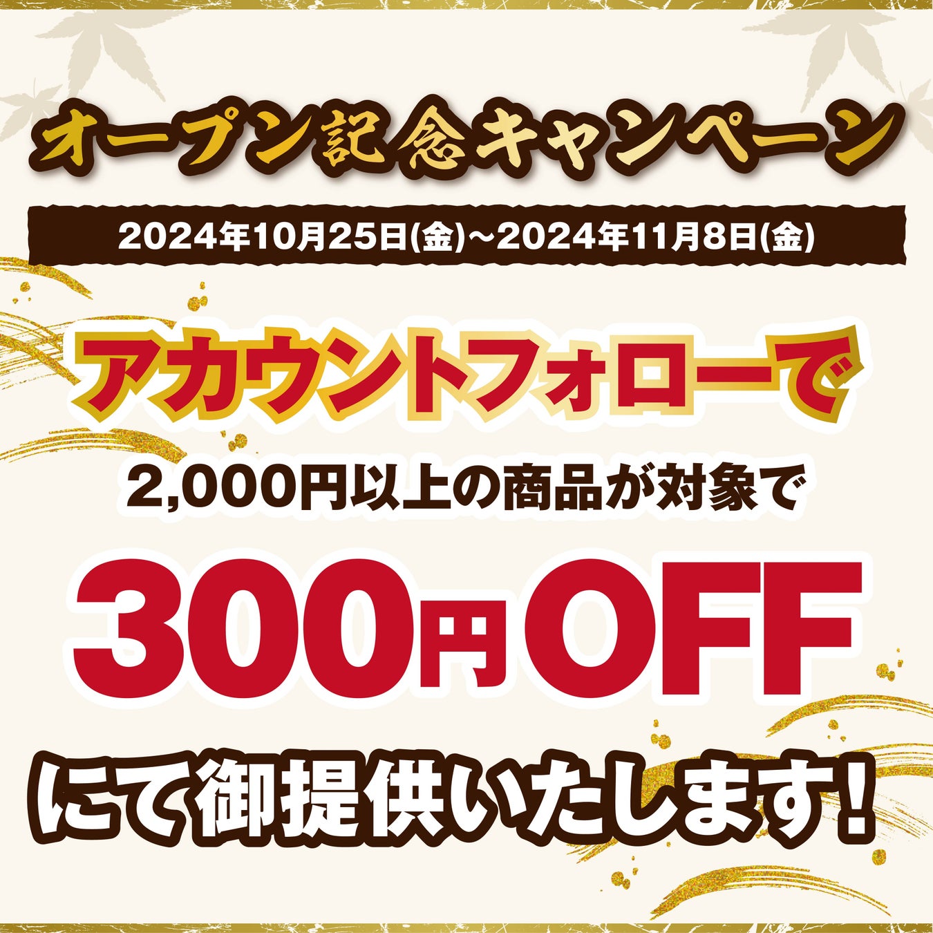 Instagram公式アカウントをフォローした方限定で、2024年10月25日(金)〜2024年11月8日(金)の期間内「2000円以上の商品」が対象で300円OFFでご提供!