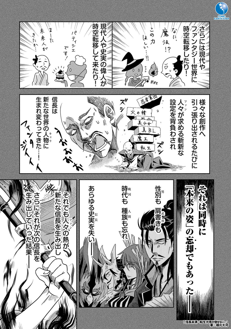 漫画やアニメ、ゲームなど後世の人間の創作によって、史上最もオモチャにされた武将・織田信長は、様々な「創作の信長」の世界へ転生を繰り返すうちに、武将という身分も生きた時代も性別すらも忘れ去って、現代で燃えカスのように燻っていた。
