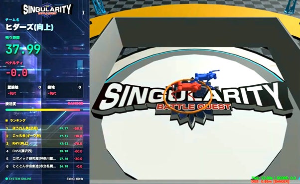 8チームが鬼から逃げるタイムリミット・サバイバルに挑戦!競技開始直後からジワジワと迫る赤い鬼ロボから60秒間逃げ切るために、「鬼との距離」や「壁からの距離」などが最適になるように「報酬」と「ペナルティ」のパラメータを調整し、深層強化学習で鬼から逃げるモデルを開発。優勝した向上高等学校「ヒダーズ」のロボは、一旦鬼を引き付けた後、絶妙にサイドにかわし、逃げ切れたチームがゼロのなか、逃げ切りまであと1歩という好成績でした。