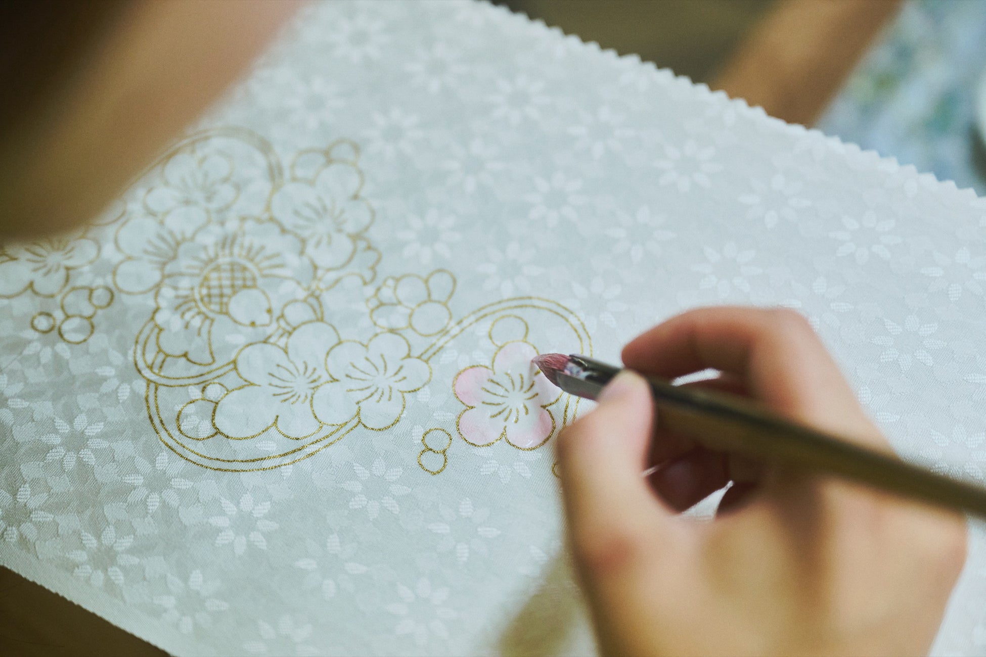 1600年頃に京都で生まれたとされる友禅は、徳川幕府の時代に江戸へ絵師や染師が移ってきたことで独自の進化を遂げます。華やかさを抑えて単彩の中にも感じられる気品は、江戸の粋を伝えるものかもしれません。ゲストは、下絵を選び着物の半襟へ友禅染を施します。優美な正絹の半襟に、淡い色を重ねていく作業は、時を忘れます。