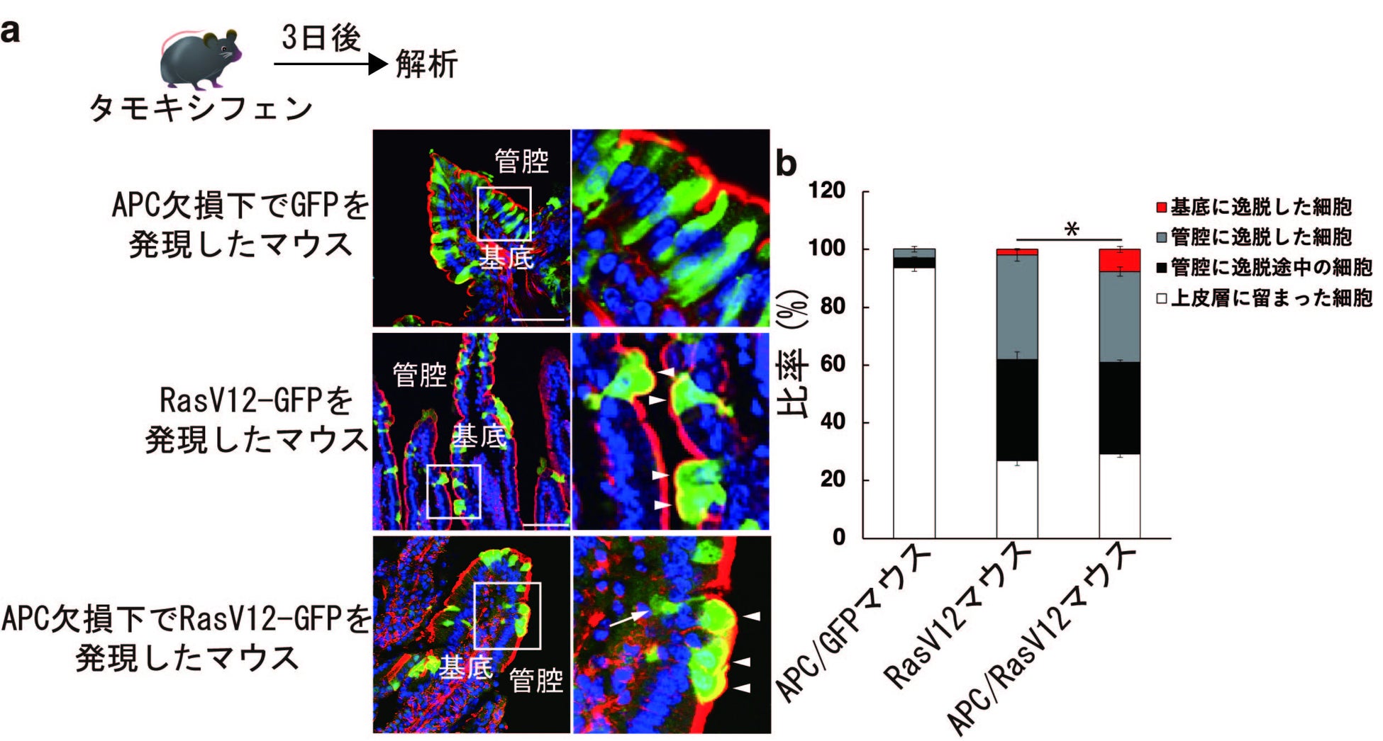 (a)タモキシフェンによるRas変異誘導3日後のAPC欠損下でGFPを発現したマウス、RasV12-GFPを単独に発現したマウス、APC欠損下でRasV12-GFPを発現したマウスの腸管の様子を示す(左図)。矢頭は管腔側へ逸脱した細胞、矢印は基底膜へと浸潤した細胞を示す。青は核、赤はphalloidin、緑はRasV12を示す。(b)各マウスにおける管腔、もしくは基底に逸脱した細胞の比率を定量化した結果を示す。APC欠損下でRasV12-GFPを発現したマウスでは基底に逸脱する細胞数が有意に増加する(*<0.01)。スケールバー (50 μm)。