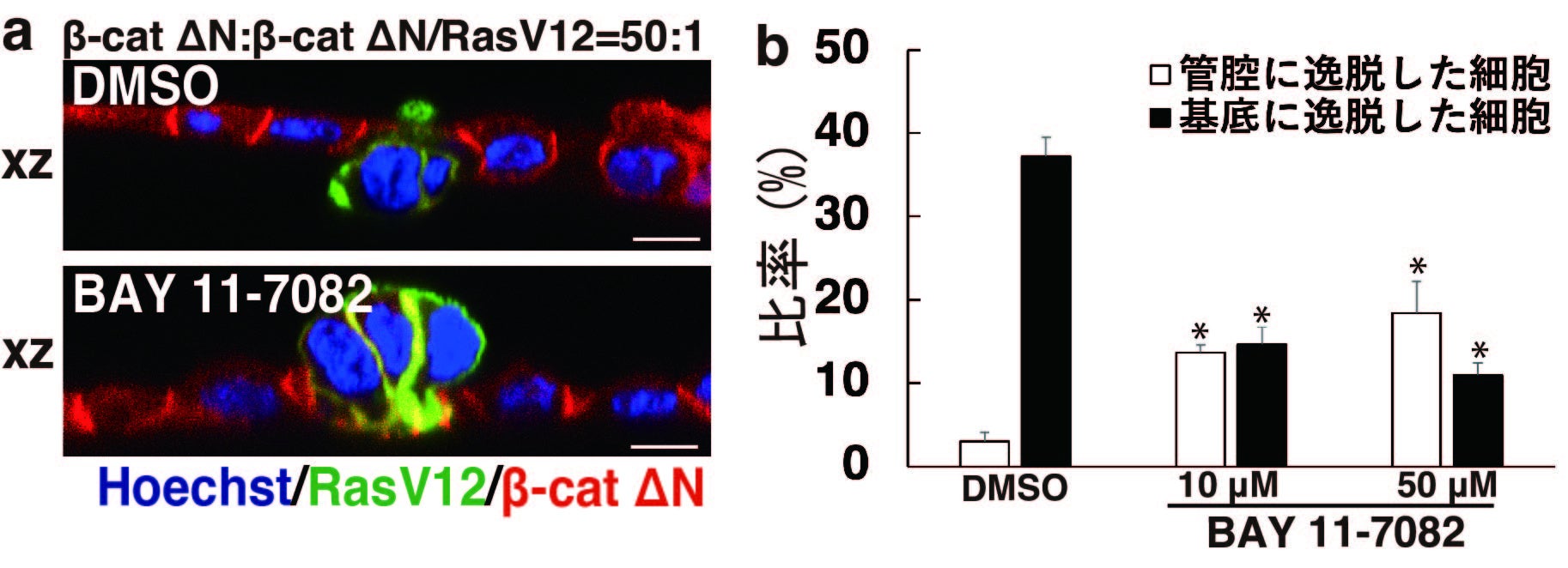 (a)β-catΔN細胞とβ-catΔN/RasV12細胞を50:1の比率で共培養し、DMSOもしくはNF-κBシグナルの阻害剤であるBAY 11-7082を添加した細胞層のxz像を示す。青は核、緑はRasV12、赤はβ-catΔNを示す。スケールバー (10 μm)。 (b) DMSOまたは10、50 μMの BAY 11-7082を添加した際の管腔もしくは基底に逸脱した細胞の比率を定量化した結果を示す。BAY 11-7082はβ-catΔN/RasV12細胞の基底への逸脱率を低下させ、相対的に管腔への逸脱率を増加させる(*<0.05)。