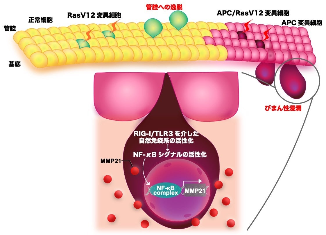 絨毛にてRasV12細胞が単独に産生した場合、細胞競合により変異細胞は管腔側に排除される。一方、APC遺伝子が変異した上皮層にRasV12細胞が出現すると、RIG-I/TLR3の自然免疫系を介したNF-κBシグナルの活性化によりMMP21の産生が促進され、変異細胞はびまん性に浸潤する。