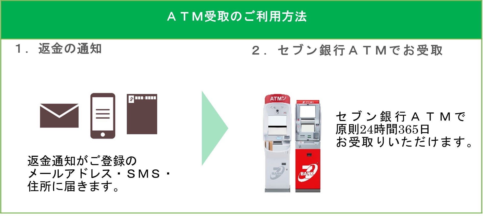 本件により、 EC・通信販売の後払い決済代行サービス利用者に返金が発生した場合、お近くのセブン銀行ATMで原則24時間365日現金による返金の受取りが可能となります。