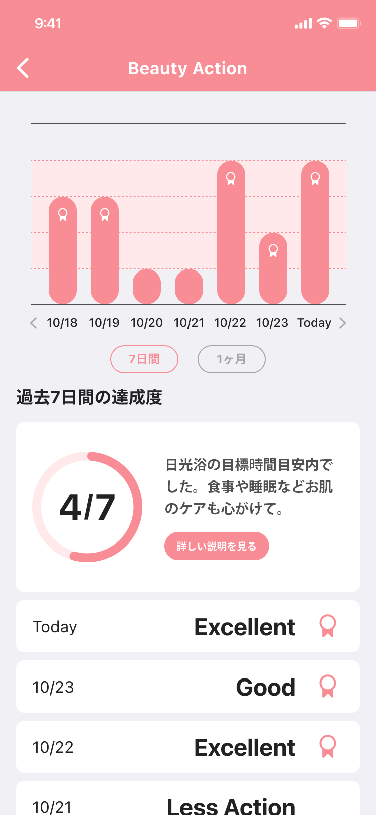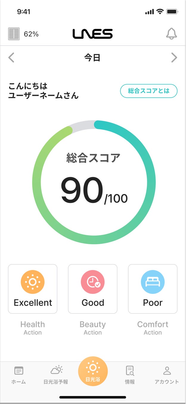 して活動ログ化され、総合スコアとして⽇々のちょうどよい⽇光浴として⽬安評価が提案されます。