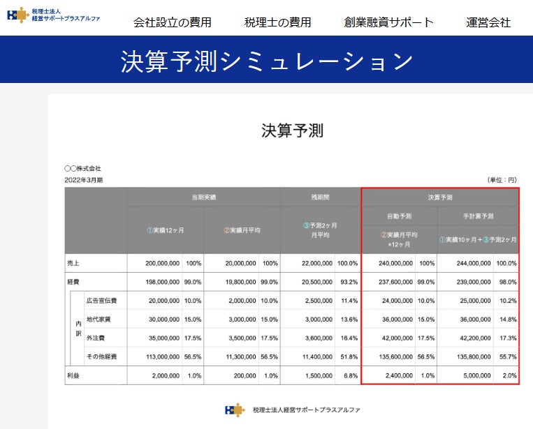 起業家のチャレンジを総合的に支援する株式会社経営サポートプラスアルファホールディングス(所在地:東京都豊島区)および税理士法人経営サポートプラスアルファ(同左)は、現状から決算予測を立てられる「決算予測シミュレーション」ツールを提供しています。