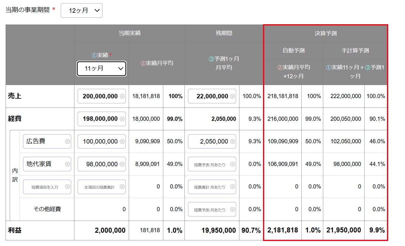 決算予測のシュミレーションには、実績や予測などの情報が必要です。それぞれ入力してください。赤枠の部分へ自動的に数値が反映されます。