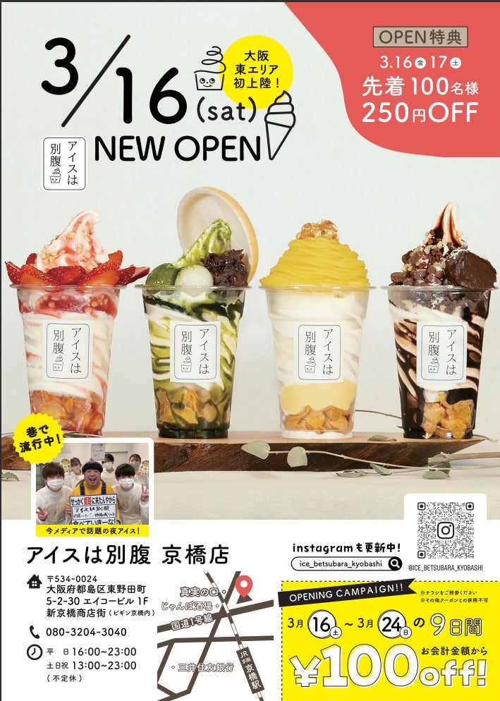 大阪東エリア初上陸!1日最高780個販売“夜パフェ専門店”「アイスは別腹 京橋店」3/16(金) グランドオープン