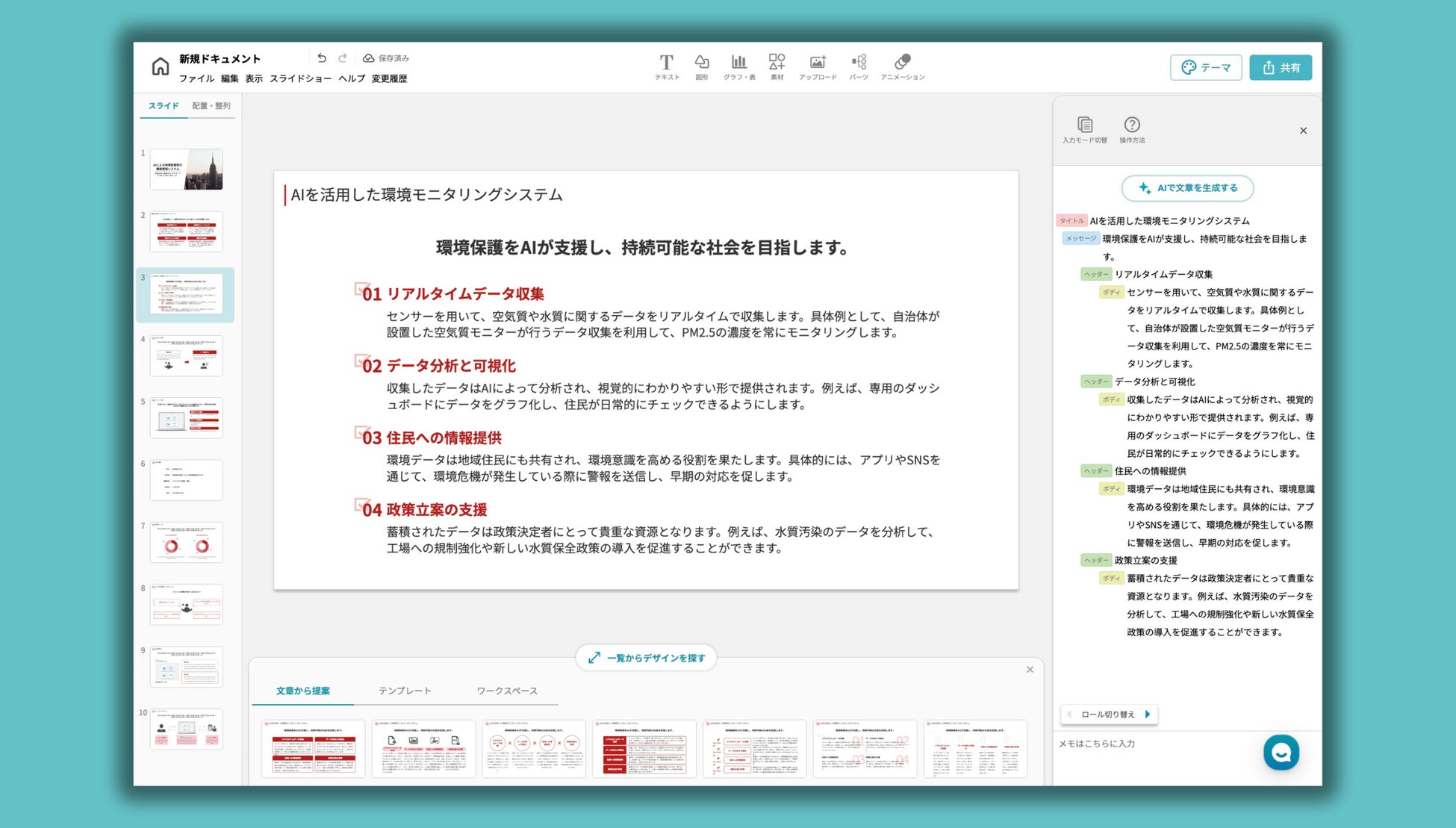 海外発のAIツールでは、ビジュアルインパクトを重視した派手なプレゼン向けスライドが多く、国内のビジネスシーンには合わないケースも少なくありません。