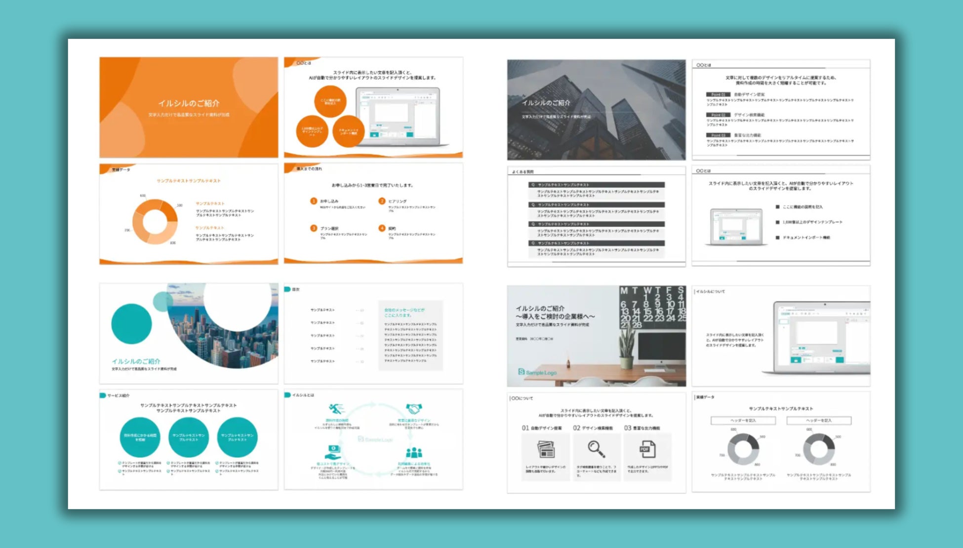 AI搭載スライド自動生成サービス「イルシル」は、生成AIでスライド資料作成を自動化し、誰でも簡単にスライドやパワポが作れるサービスです。入力したテキストからスライドを自動生成できるだけでなく、3,000種類以上のデザインテンプレートからオリジナルで作成することも可能です。