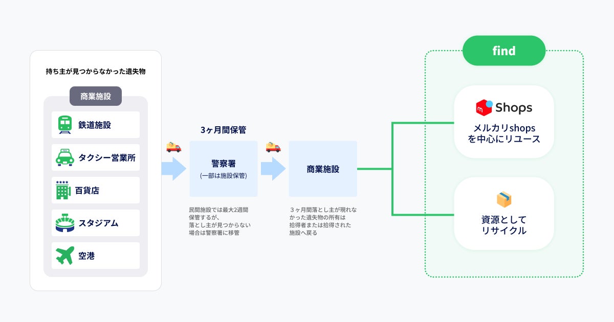 「落とし物クラウドfind」を提供する株式会社find(所在地:東京都中央区、代表取締役CEO:高島 彬、以下「find」)は、鉄道会社や商業施設などの提携先企業で拾得された落とし物のうち、法的に保管期間が過ぎ、各企業が所有権を取得したものを、株式会社メルカリ(本社:東京都港区、代表執行役 CEO:山田進太郎、以下:メルカリ)が運営するEコマースプラットフォーム「メルカリShops」にてリユースさせる循環モデルの実証実験を本日より8月末まで実施します。
