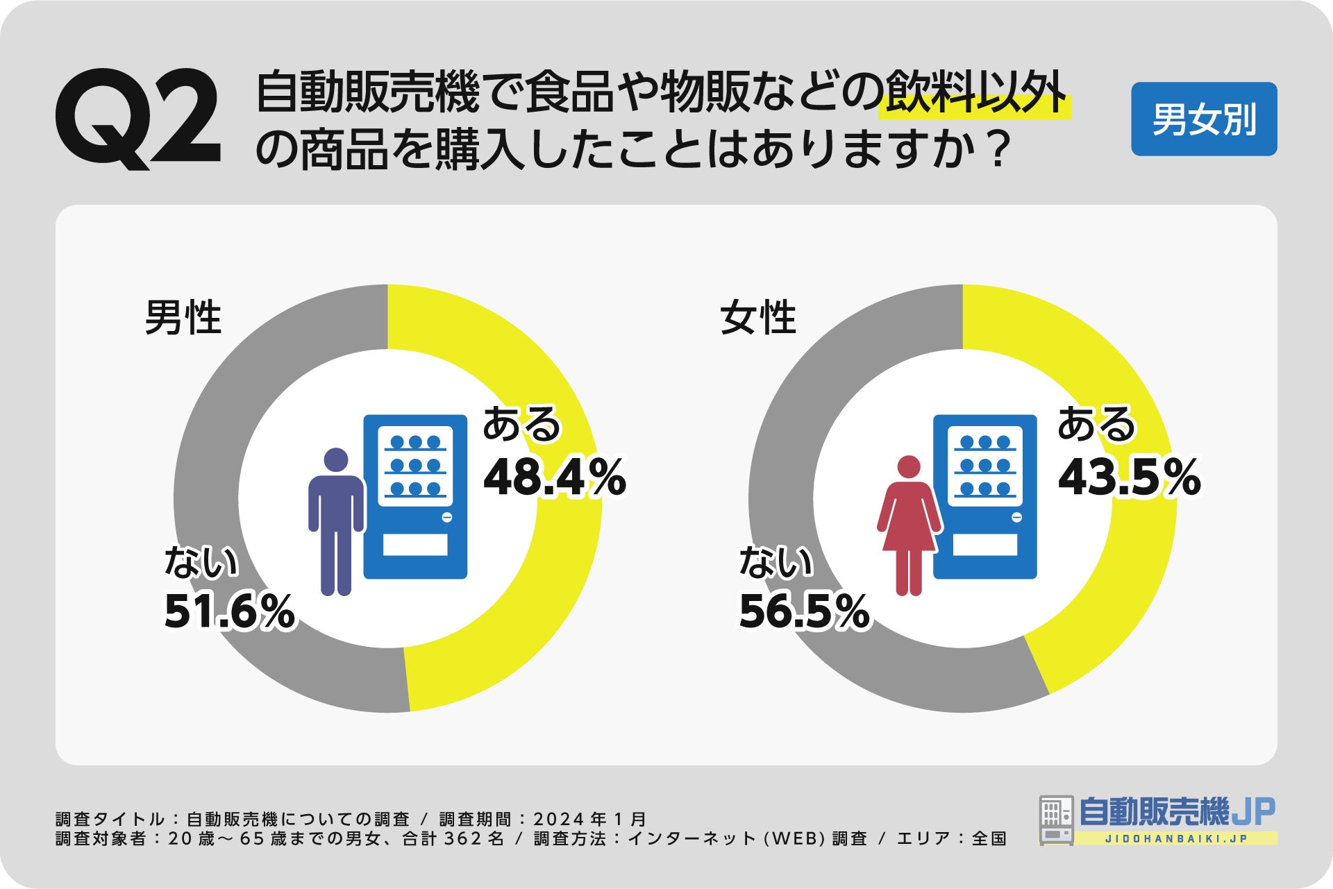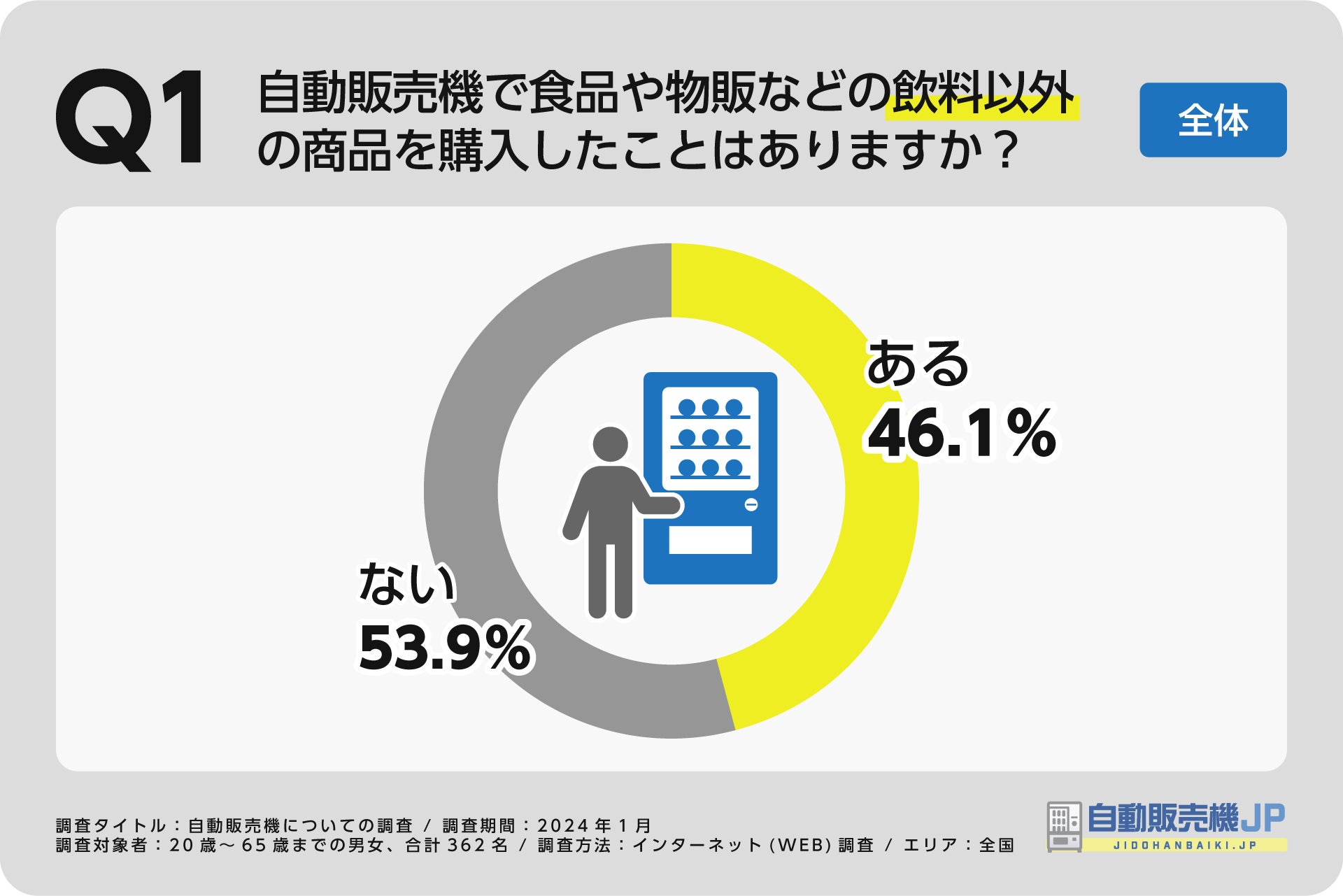 全国の20歳~65歳までの男女362名を対象にアンケート調査をおこなったところ、回答者の約半数(46.1%)が自動販売機で飲料以外の商品を購入した経験があることが明らかになりました。一方で、53.9%の回答者は飲料以外の商品の購入経験がないと回答しています。
