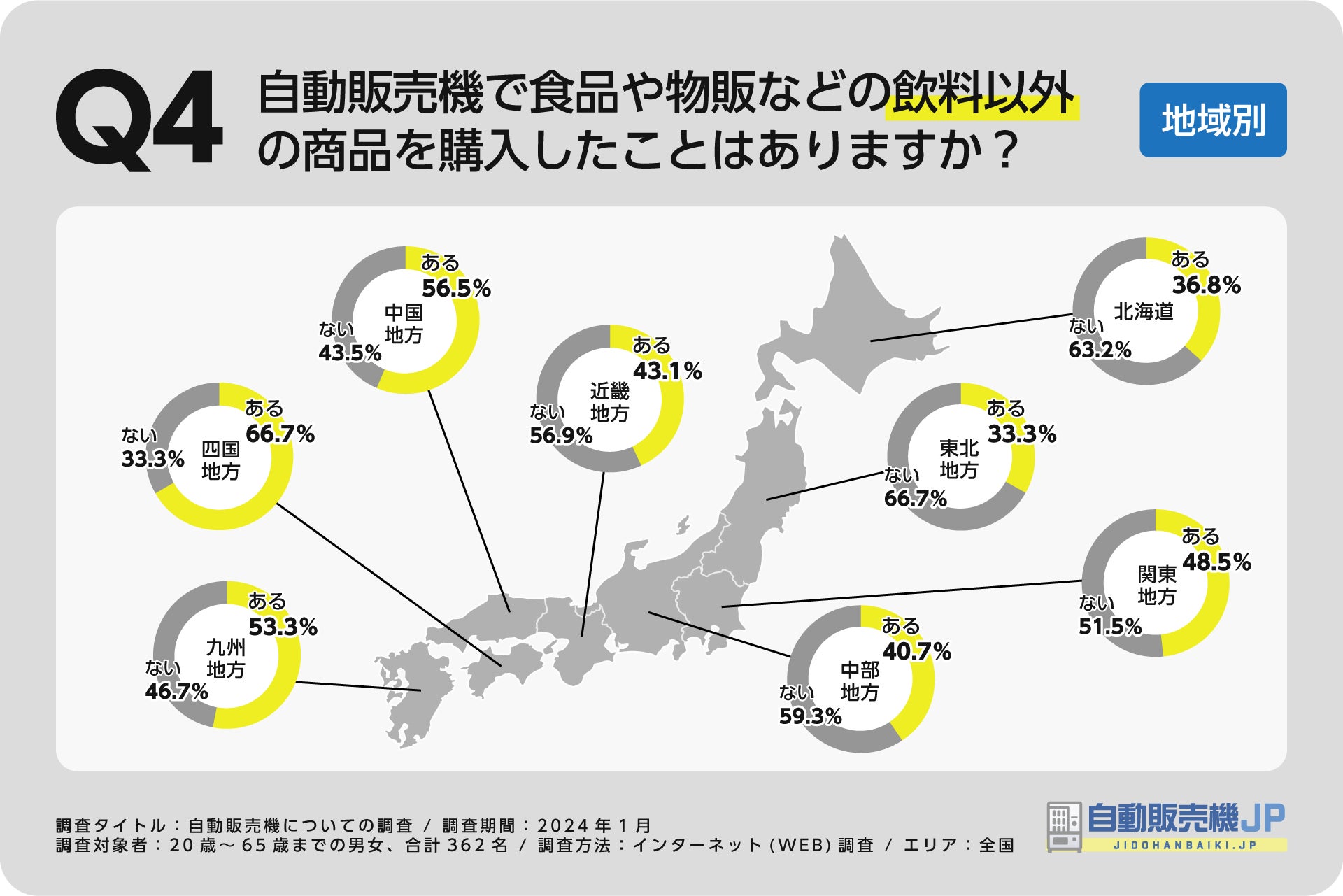 特に四国地方での購入経験が最も高く(66.7%)、東北地方で最も低い結果(33.3%)となりました。
