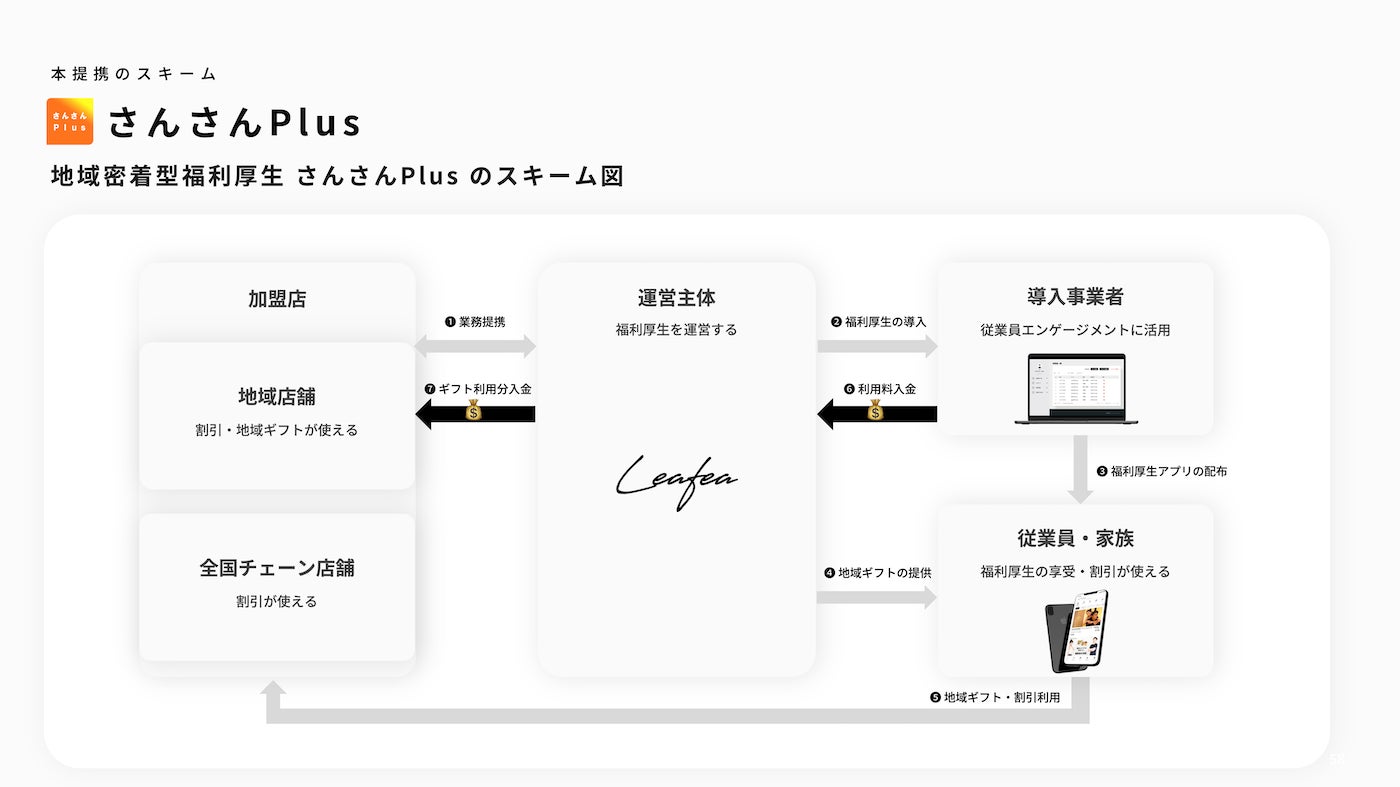 リーフィが提供する地域密着型福利厚生サービス(専用アプリ名称:「さんさんPlus」)は、第三の賃上げと言われる企業の従業員向け福利厚生の充実のため、アプリを通じて従業員へのギフト還元や従業員の家族も利用できるクーポンの提供、および導入いただいた企業で働く従業員の働きがいやエンゲージメント向上を支援する内容となっています。