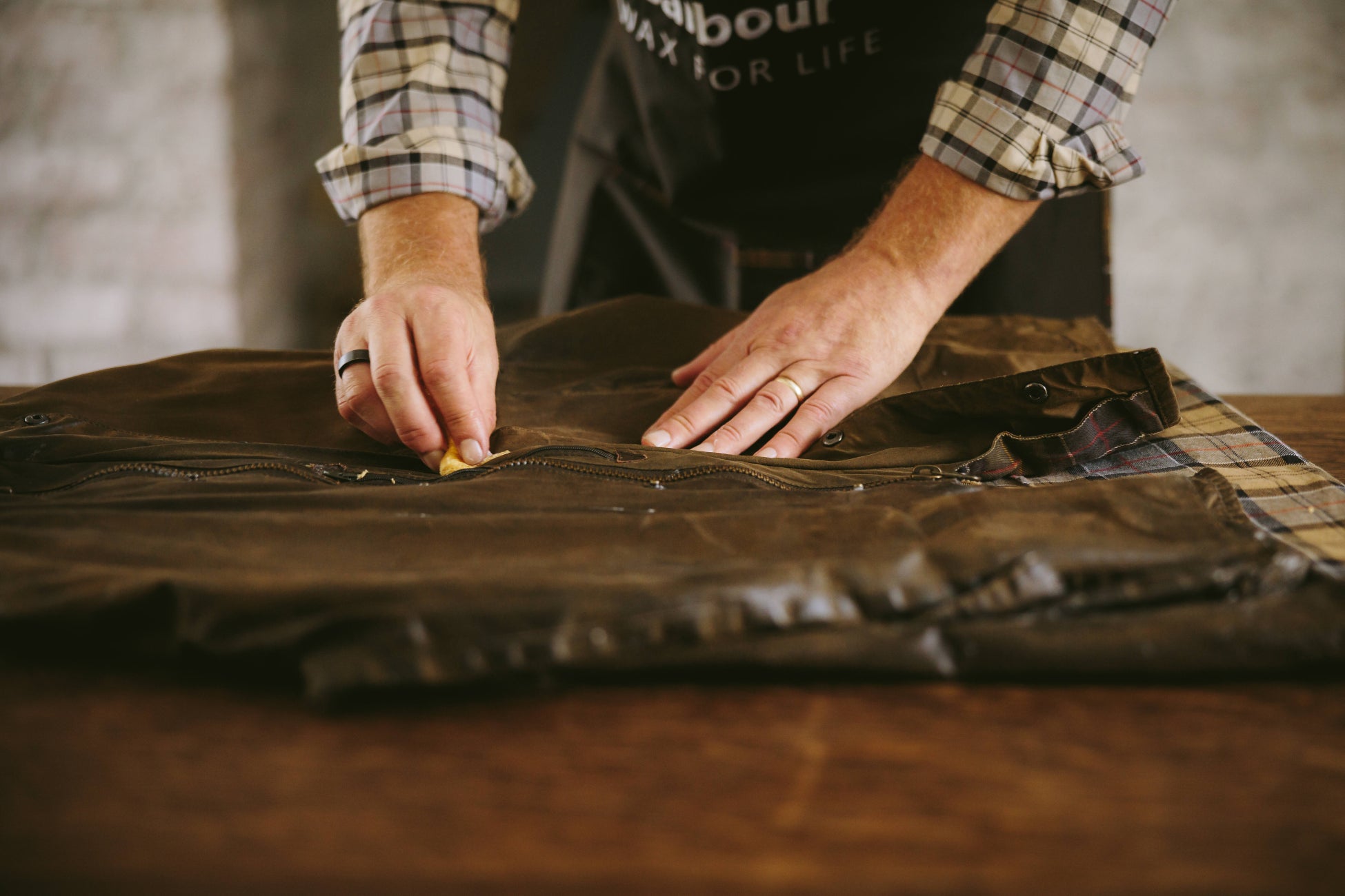 ワックスジャケットにリワックスすることで撥水性を保つメンテナンスデモンストレーションを不定期開催します。