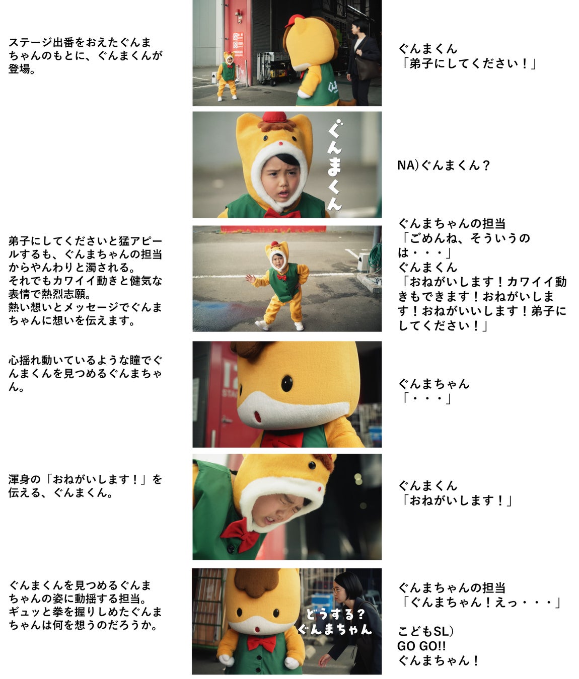 ぐんまくんは、ぐんまちゃんの可愛さに感銘を受け、将来の夢を『ぐんまちゃんになること』と強く決意している、7歳の少年だ。ステージ出番を終えたぐんまちゃんのもとに登場したぐんまくんは、「カワイイ動きもできます!お願いします、弟子にしてください!」と猛アピール。ぐんまちゃんの担当から「ごめんね、そういうのは・・・」とやんわりと濁されるものの、「おねがいします!」と熱烈なアピールは続きました。果たしてぐんまちゃんは、初の弟子入りを受け入れるのか。ぐんまくんの熱いまなざしに心揺れ動くぐんまちゃんの表情でCMは締めくくられました。