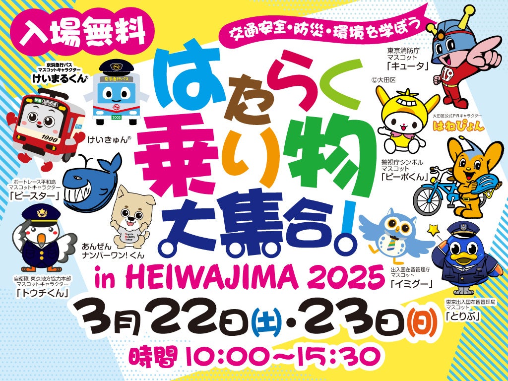 見て、体験して交通安全や防災・環境について楽しく学ぼう! 2025年3月22日(土)・23日(日)、第3回目となる「 はたらく乗り物大集合!in HEIWAJIMA」イベントを開催します。