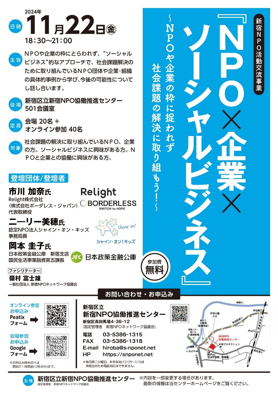 【交流イベント③】11/22(金)開催『NPOx企業×ソーシャルビジネス』~NPOや企業の枠にとらわれず社会課題の解決に取り組もう~