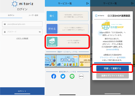 再度アプリを起動し、ログイン画面より①で入力したメールアドレスとパスワードを入力してアプリにログイン。「ロス活SHOP」を押してID連携の同意を選択してください。
