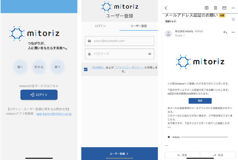 アプリを立ち上げ、ログイン。ユーザー登録を選択肢、任意のメールアドレス・パスワードを入力し、ユーザー登録。ご入力したアドレス宛にメールアドレス認証メールが届くので「認証」ボタンをタップし、メール認証完了です。
