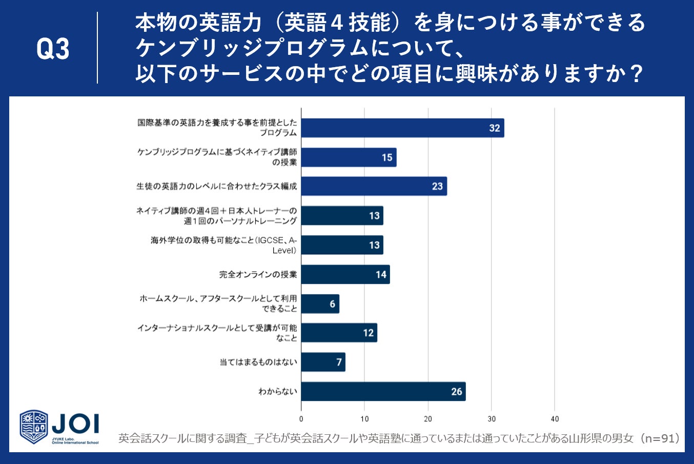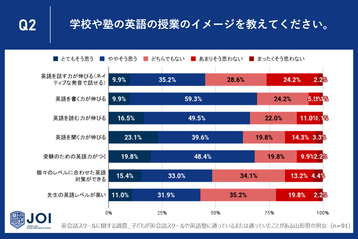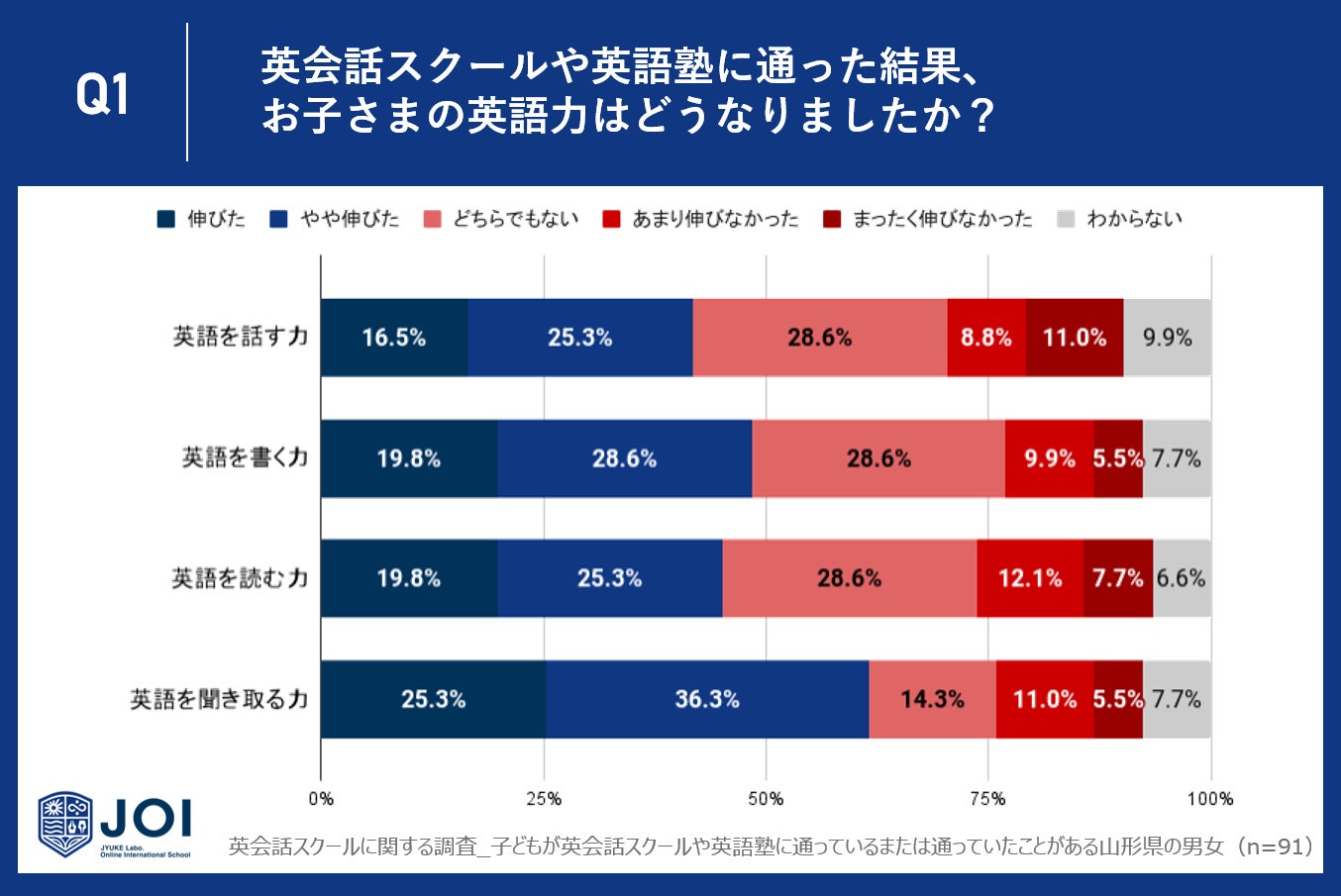 今回は、子どもが英会話スクールや英語塾に通っているまたは通っていたことがある山形県の男女91人に、英会話スクールや英語塾の効果に関するアンケート調査を実施しました。