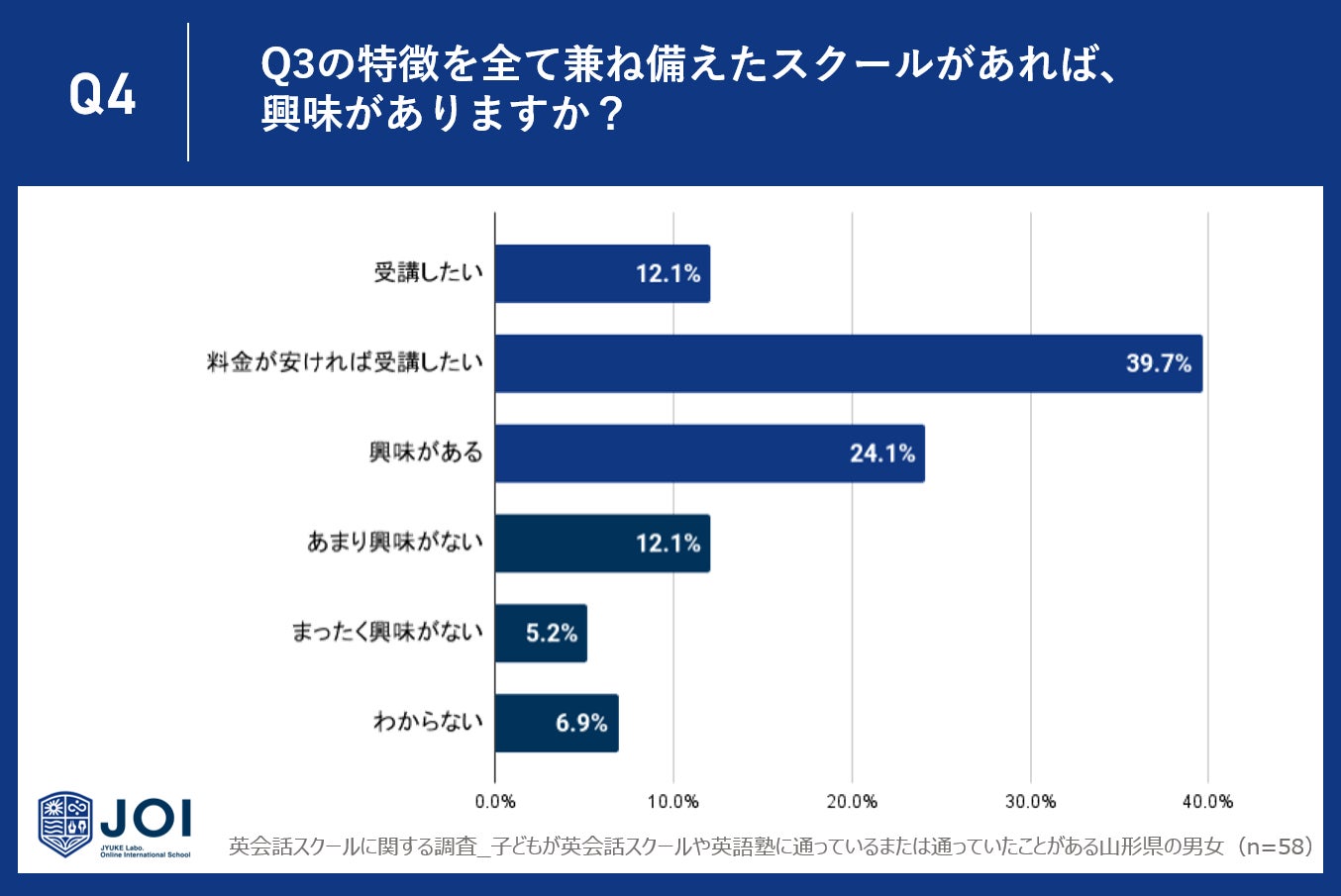 Q4で「Q3の特徴を全て兼ね備えたスクールがあれば、興味がありますか?」と質問したところ、山形県では12.1%が受講を希望し、39.7%は料金が手頃であれば受講したいと考えています。さらに、24.1%は興味を示していると回答しました。多くの人がこのような特徴を持つスクールに一定の興味を示していることが分かります。
