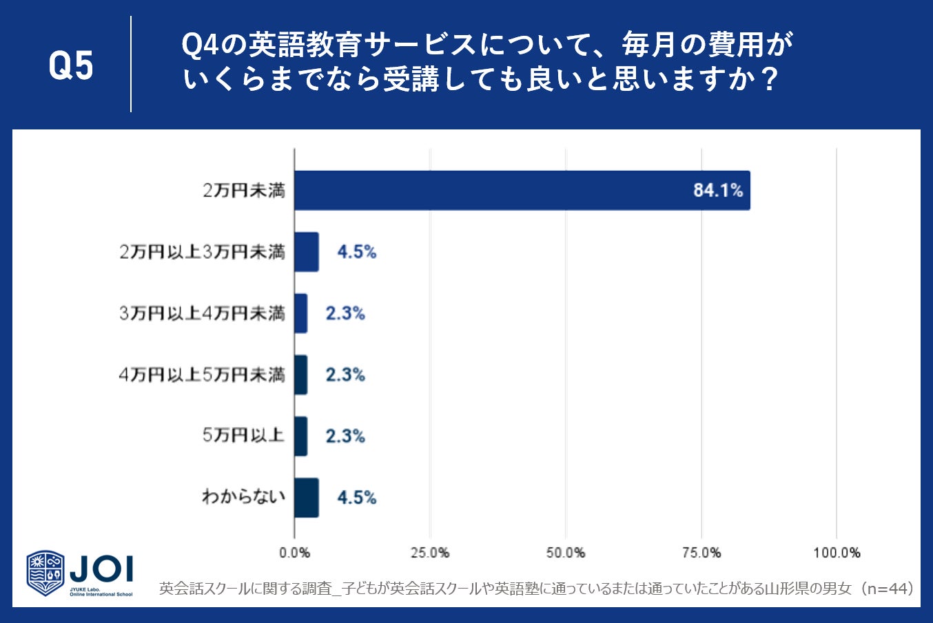 Q4で「受講したい」「料金が安ければ受講したい」「興味がある」と回答した人に、Q5で、「Q4の英語教育サービスについて、毎月の費用がいくらまでなら受講しても良いと思いますか?」と質問したところ、最も多い84.1%の回答者は2万円未満が適切と感じています。4.5%は2万円以上3万円未満、2.3%は3万円以上4万円未満と答えました。対照的に、4万円以上の費用を考える回答者は極少数で、4万円以上5万円未満が2.3%、5万円以上が2.3%でした。これにより、山形県では多くの人が3万円未満の価格帯を望んでいることが明らかとなりました。