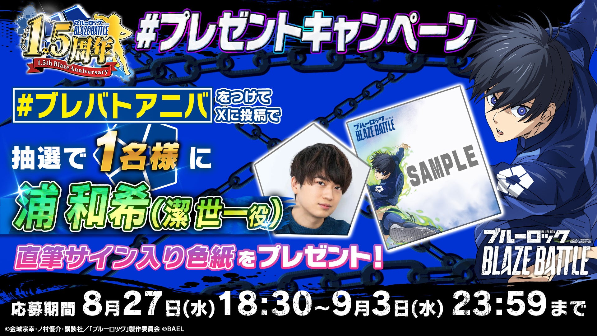 ハッシュタグ「#ブレバトアニバ」をつけてXに投稿していただいた方の中から、抽選で1名様に、ゲスト・浦和希さん(潔 世一役)の直筆サイン色紙をプレゼントいたします。