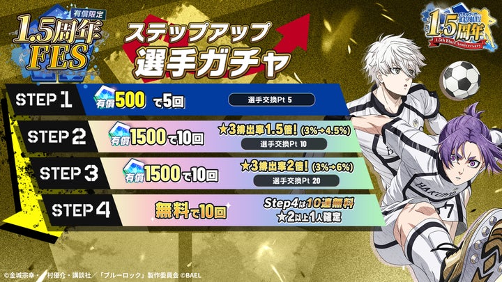 「【有償限定】1.5周年フェスステップアップ選手ガチャ」を開催します。