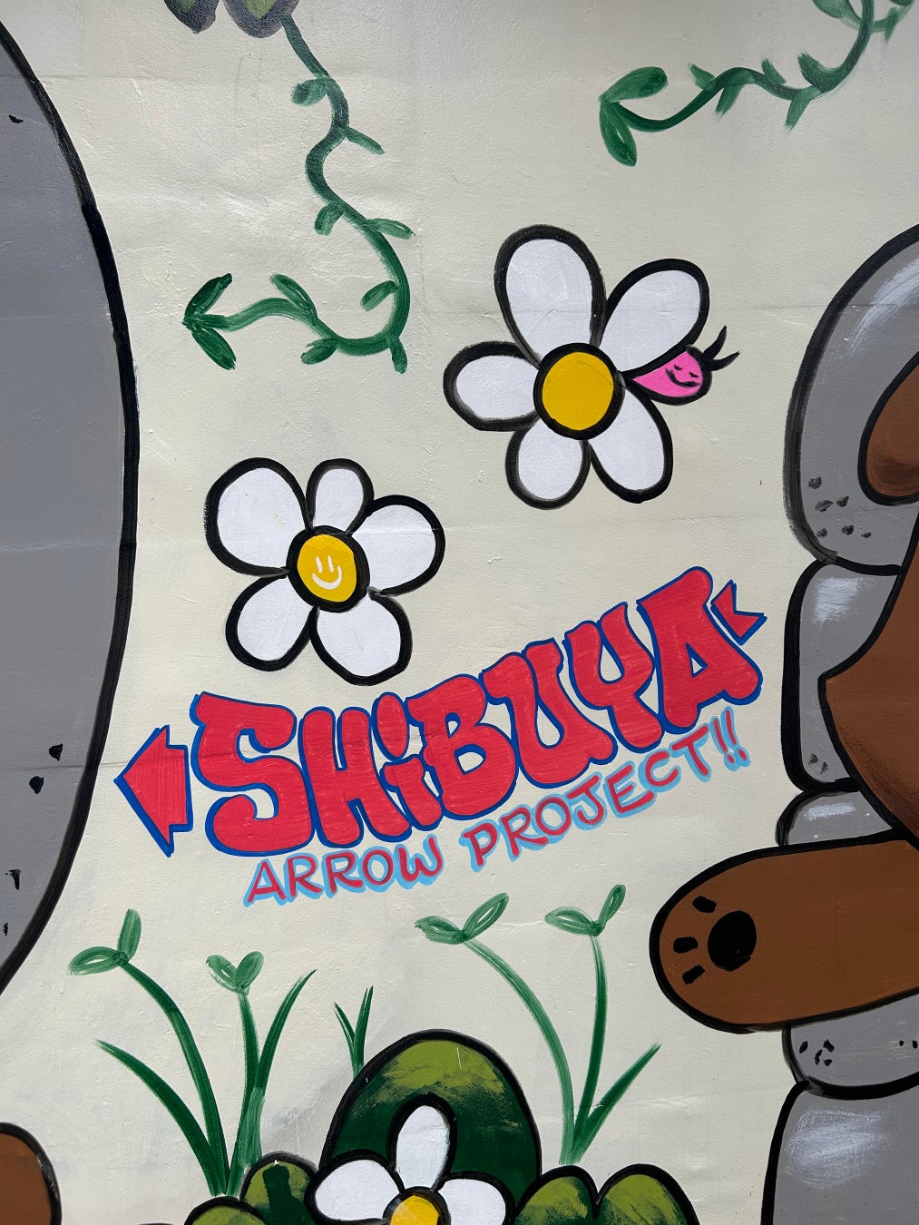 このたびのミューラルアートは、壁の所有者、渋谷区環境政策部環境整備課、渋谷公園通商店街振興組合のご協力のもと、「シブヤ・アロープロジェクト」(災害時の帰宅困難者対策として、アート作品を制作することで「一時退避場所」の位置を周知し、平時からの防災意識を高めるプロジェクト)の一環として実施されました。
