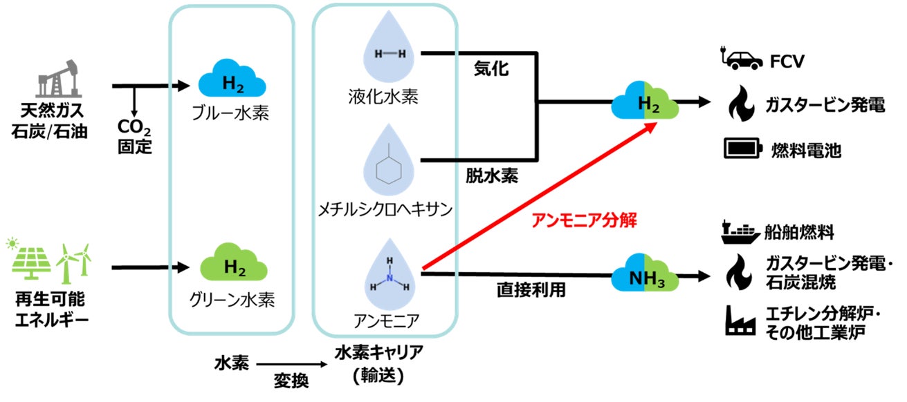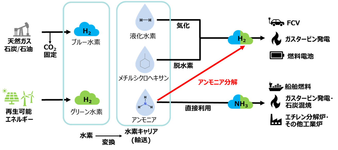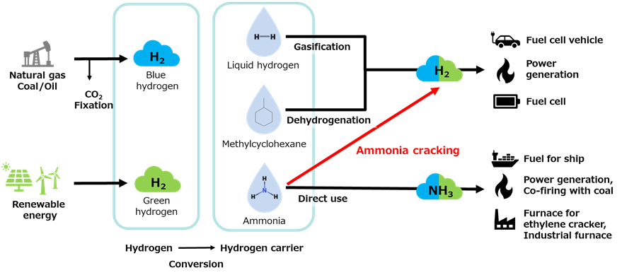 The role of hydrogen energy is crucial to the realization of a low-carbon society, and the deployment of a CO₂-free hydrogen value chain is essential. In addition to ammonia, liquefied hydrogen, and organic hydrides (methylcyclohexane) are the major carriers of hydrogen energy. The advantages of ammonia include ease of transportation and storage, direct use for power generation fuel, and a wide range of applications such as hydrogen-fired power generation and fuel cell vehicle (FCV) by extracting hydrogen from ammonia through cracking.