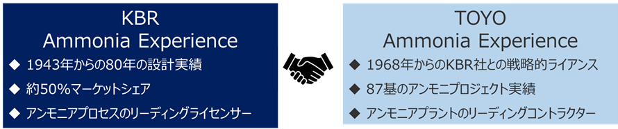 KBRは世界トップシェアのアンモニア製造プロセスライセンサーとしての高い技術力を保有しています。また、TOYOは55年に渡る同社技術プラントの建設・運転実績に豊富な経験・技術知見を保有*2しています。両社の優位性を生かすことにより、カスタマイズされた高い効果が得られる技術解決案の提案、総合的なプラント建設力を発揮できることから、共同してH2ACT℠の商業化導入を推進すべく上記覚書締結に至りました。