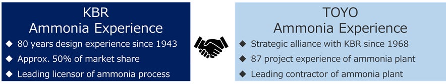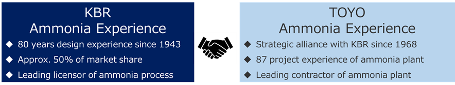 *2: TOYO has been collaborating with KBR for 55 years and possesses project experiences and knowledge with 87 ammonia plant in the world. In addition to ammonia synthesis technology, ammonia cracking technology will be added to the scope of collaboration of the two companies, contributing to the deployment of a fuel ammonia value chain that also includes hydrogen utilization.