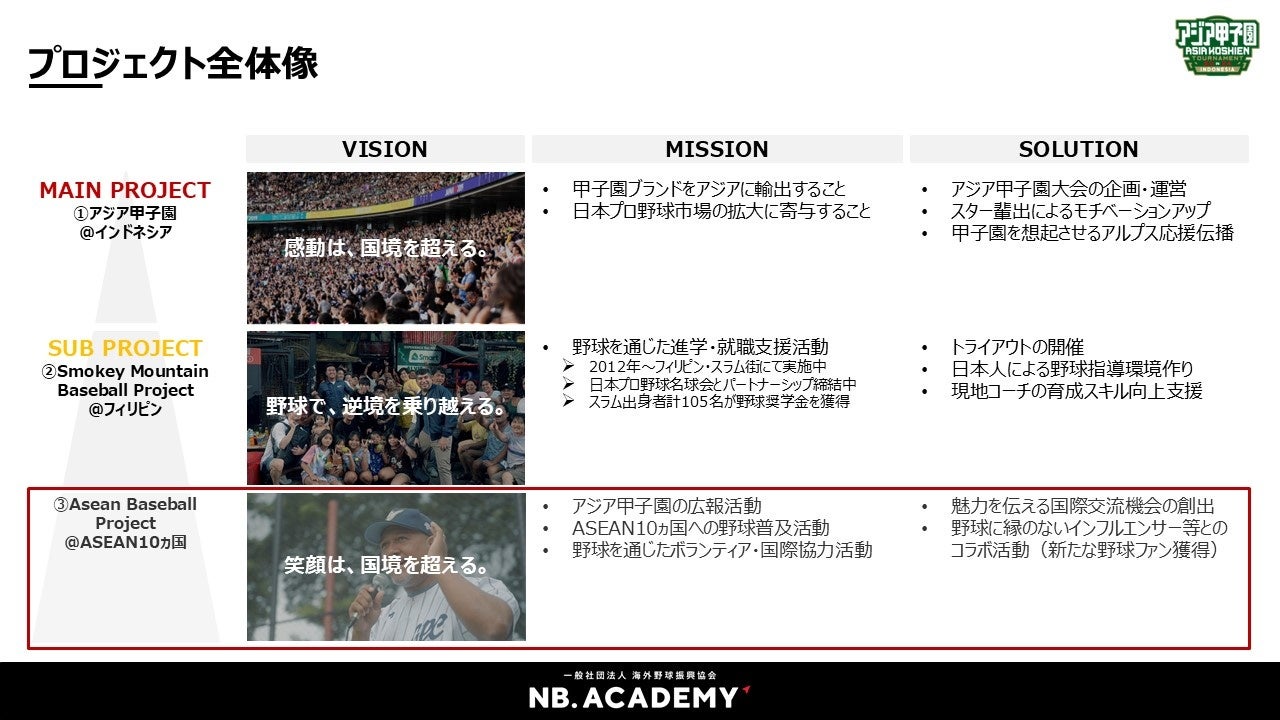 当社は、以下3つのプロジェクトを中心に活動する”海外野球振興協会”です。