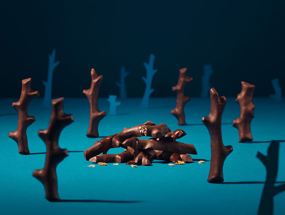 薄く焼いたクレープ生地を砕いたフィアンティーヌと、ローストアーモンドを細かく刻み、香ばしいパイを混ぜ込んだ、サクサク食感も楽しめるクリスピーミルクチョコレートです。ミルクチョコレートとスイートチョコレートの絶妙なブレンドでミルキーな味わいをお楽しみいただけます。山の版画家 大谷一良さんの作品「森の見る夢」の木々をモチーフにした3つの形のチョコレートが特徴です。